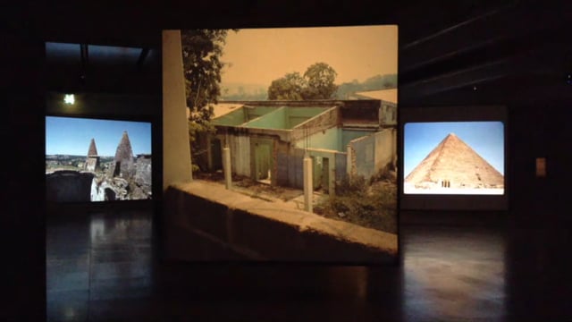 The artworks were Projected Non-Hapenning (1952-1967) by Ad Reinhardt and Hotel Palenque (1969-1972) by Robert Smithson. Both art works take the form of art history lectures presenting slide sequences and are indebted to Kubler’s The Shape of Time. One of the slideshows was composed of photos taken by George Kubler in Portugal, between 1952 and 1957 while researching about Portuguese architecture, the soundtrack was composed by sections of a lecture that Kubler gave at the Yale School of Architecture in 1974. The other slideshow was composed by images made by Paulo Varela Gomes and João Vieira Caldas in 1990 while researching for the exhibition Points de Repère: Architectures du Portugal shown in Brussels at Europália 1991, and the accompanying soundtrack was part of the keynote lecture that Varela Gomes gave the EAHN 2010 conference.